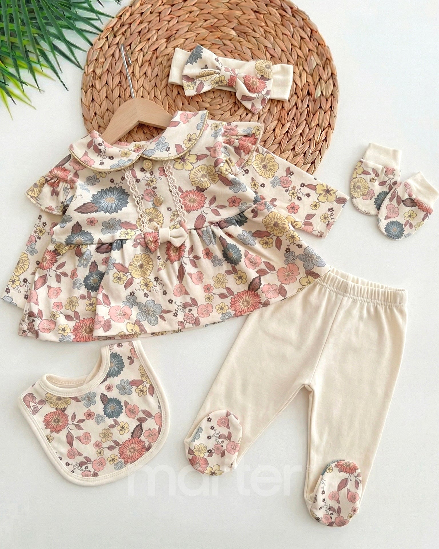 طقم مريح وفاخر للبنات حديثي الولادة، مكون من خمس قطع ليضمن لصغيرتك الراحة القصوى والأناقة الفائقة. تم تصميم الطقم بأجود الخامات لضمان راحة طفلتك ومتانتها على مر الزمان..