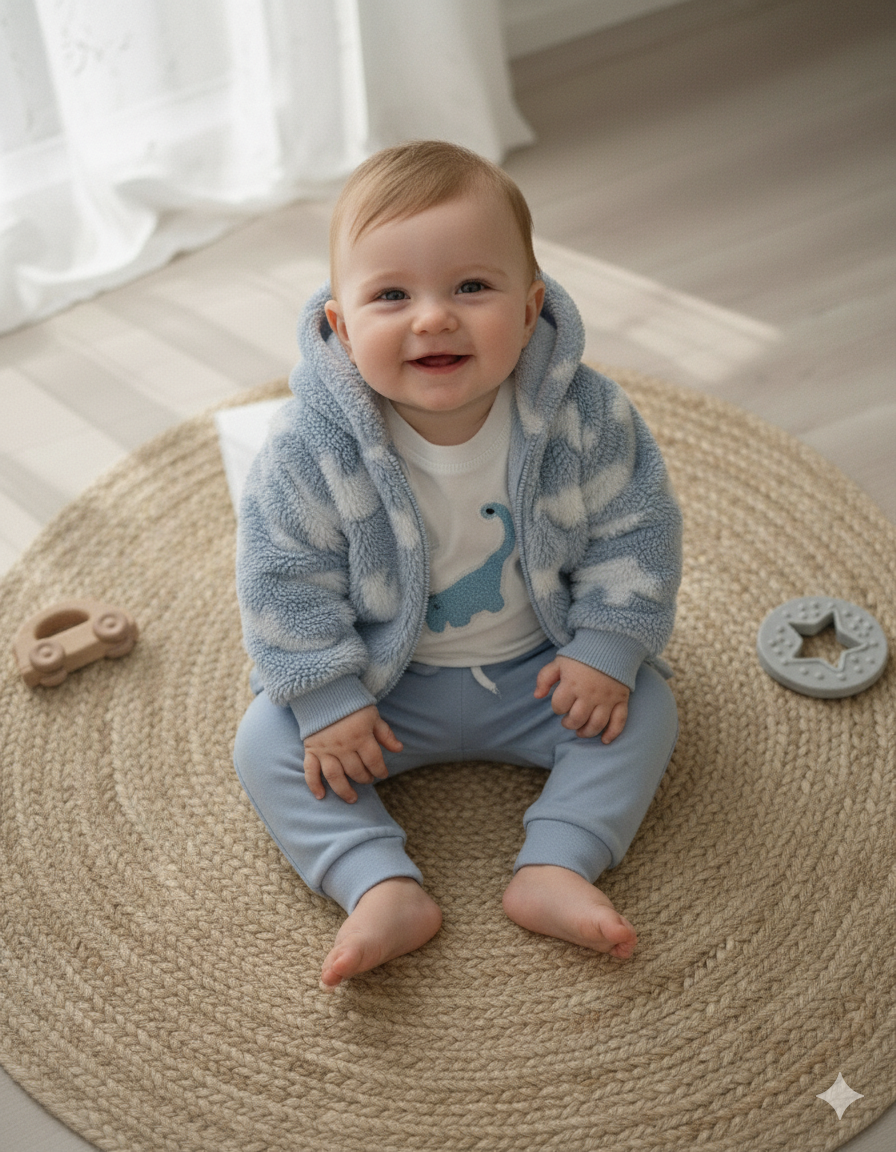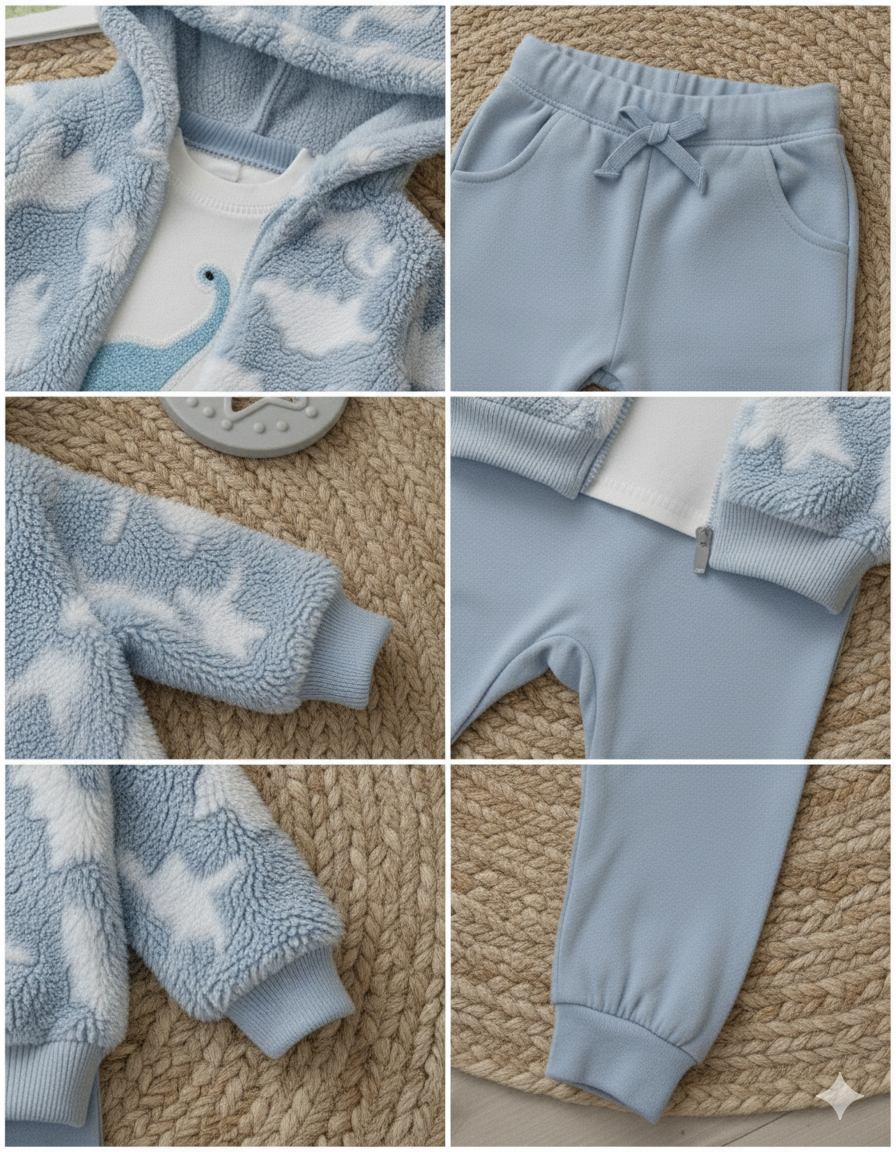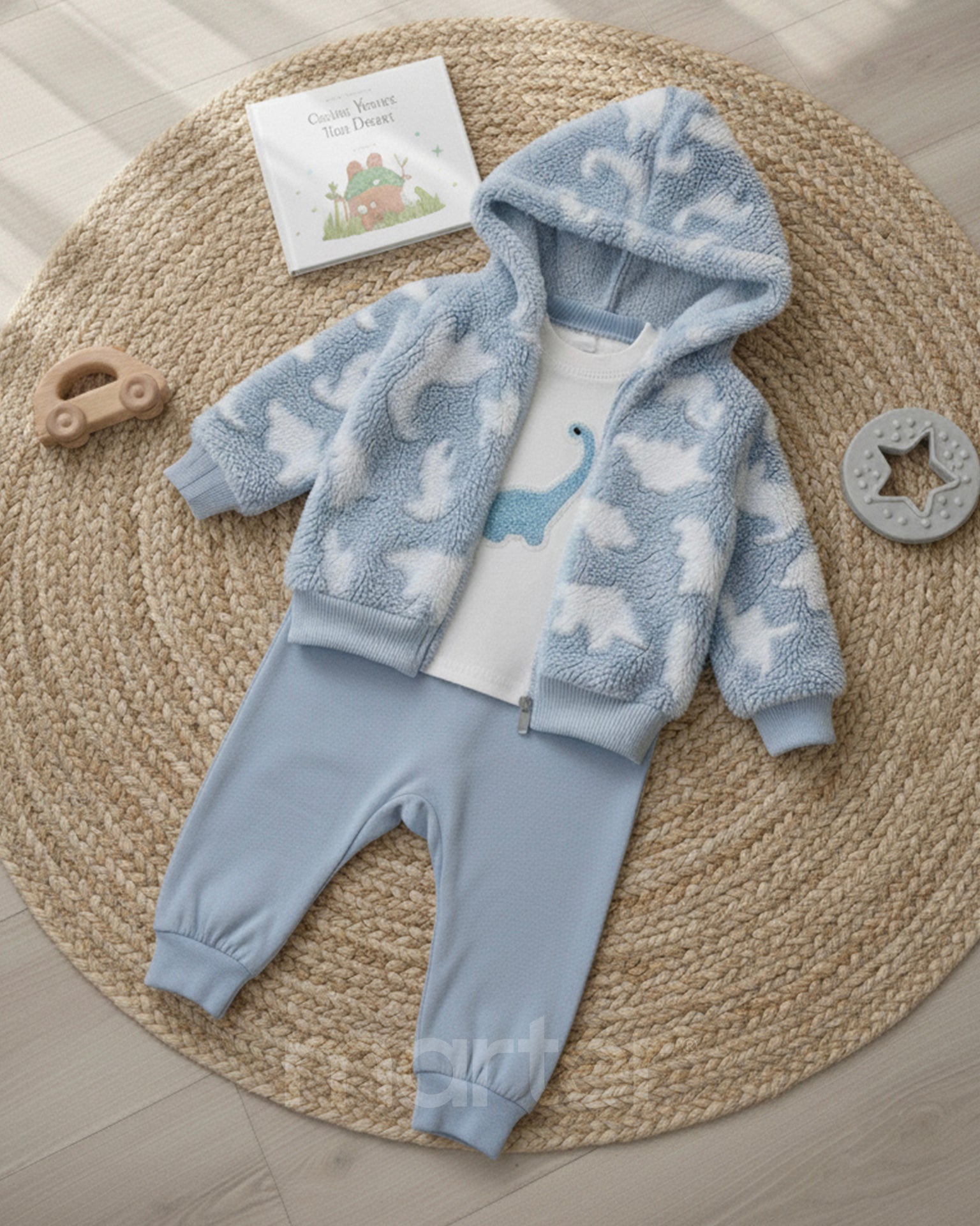 يتكوّن من 3 قطع أنيقة: سترة بقبعة مزينة بفيونكة، بودي مطبوع كرتوني، وسروال مريح.