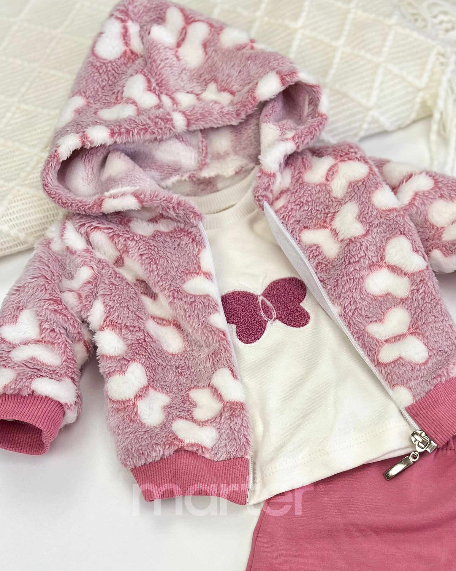 يتكوّن من 3 قطع أنيقة: سترة بقبعة مزينة بفيونكة، بودي مطبوع كرتوني، وسروال مريح.