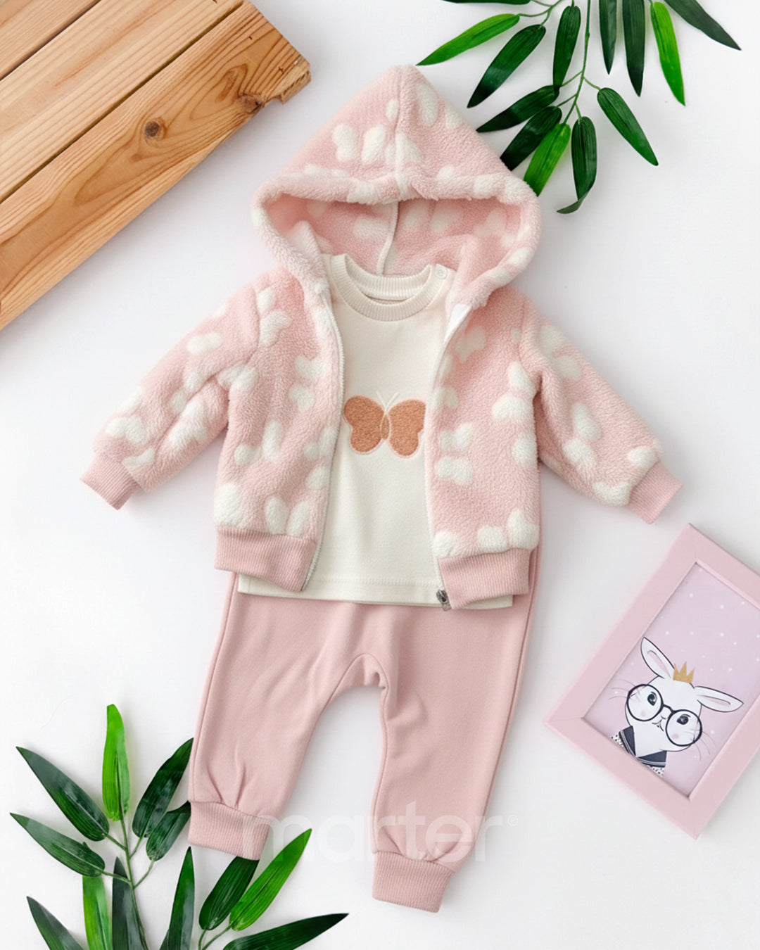 يتكوّن من 3 قطع أنيقة: سترة بقبعة مزينة بفيونكة، بودي مطبوع كرتوني، وسروال مريح.
