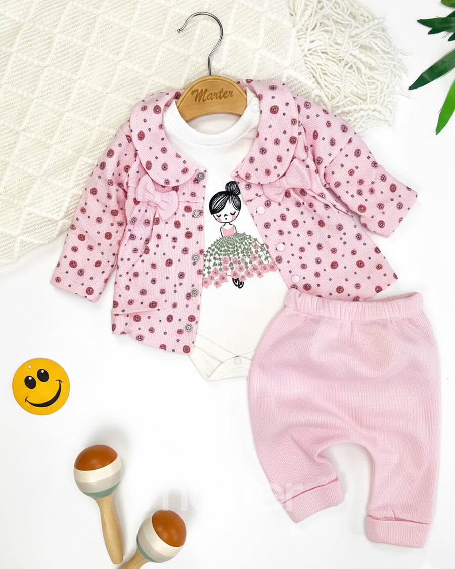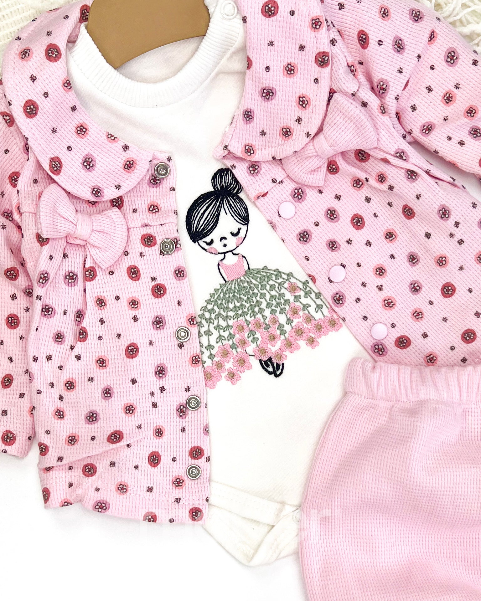 يتكوّن من 3 قطع أنيقة: سترة مزينة، بودي وسروال مريح.