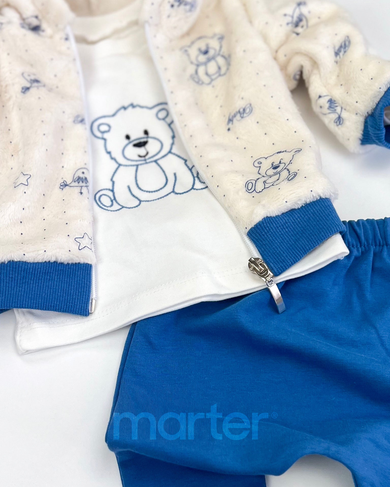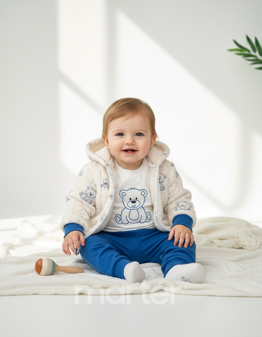 يتكوّن من 3 قطع أنيقة: سترة بقبعة مزينة بفيونكة، بودي مطبوع كرتوني، وسروال مريح.