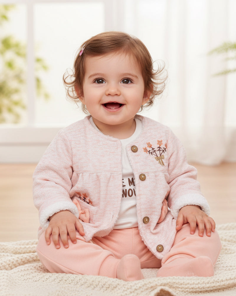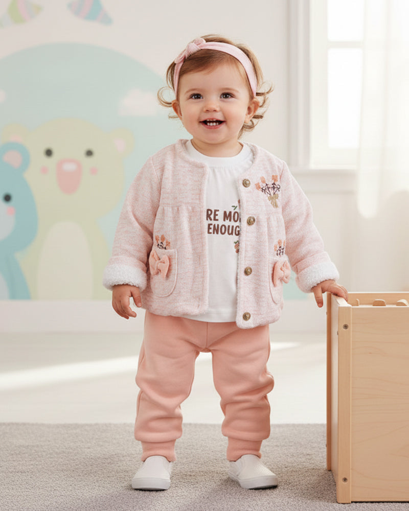 يتكوّن من 3 قطع أنيقة: سترة بقبعة مزينة بفيونكة، بودي وسروال مريح.