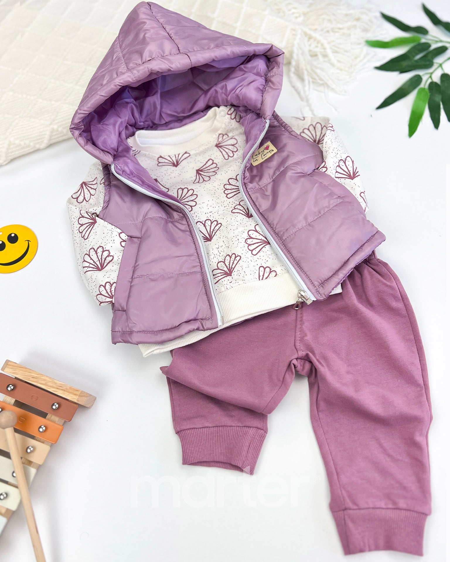 يتكوّن من 3 قطع أنيقة: سترة بقبعة مزينة بفيونكة، بودي مطبوع كرتوني، وسروال مريح.