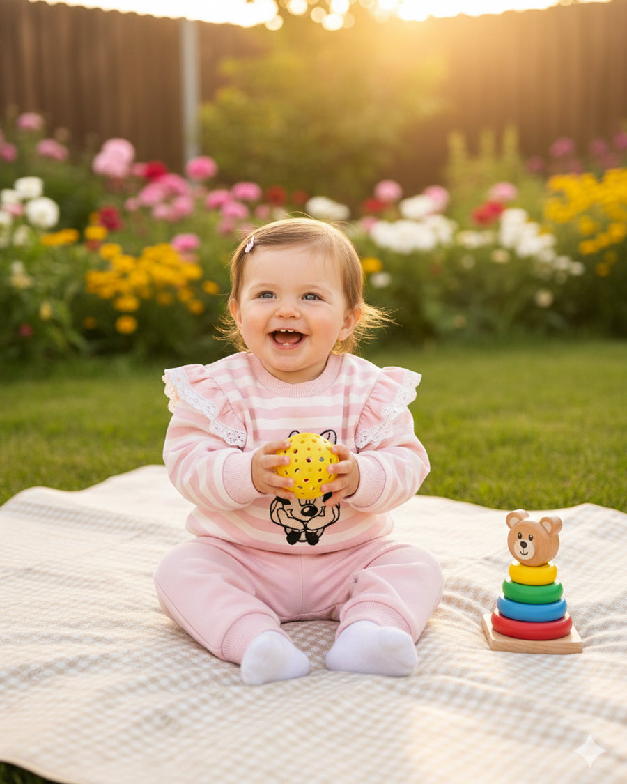 يضم هذا الطقم المذهل  تصميم مريح وعصري يمنحك مظهرًا راقيًا لطفلتك بينما يحافظ على راحته طوال اليوم!