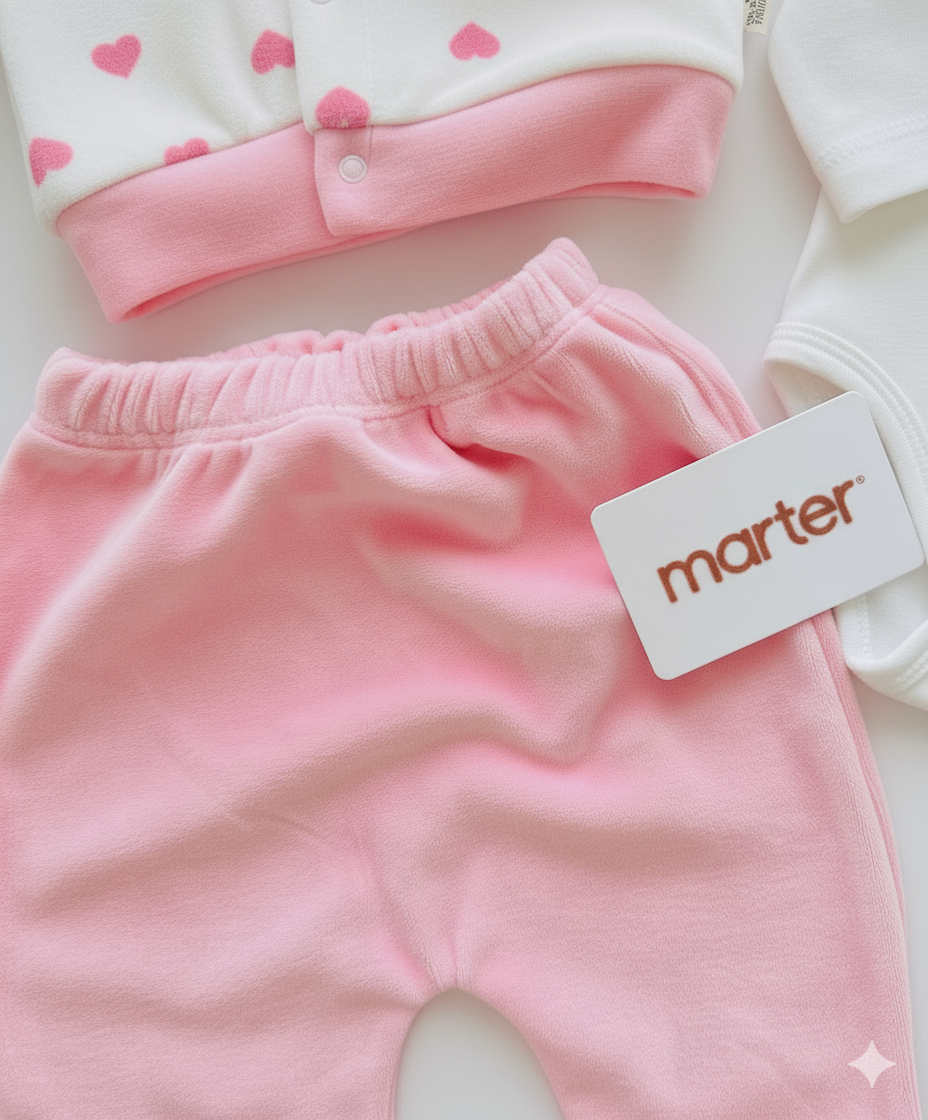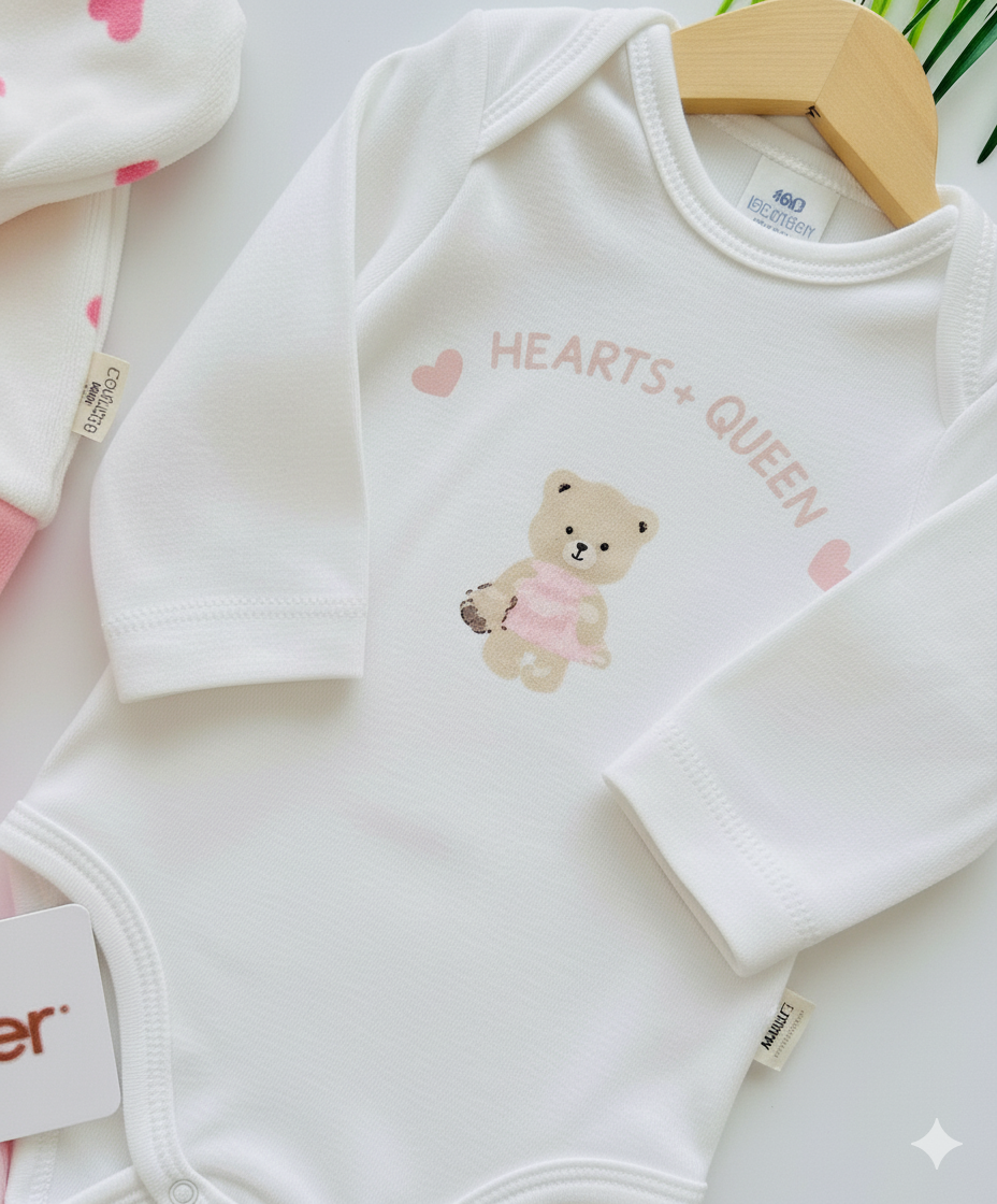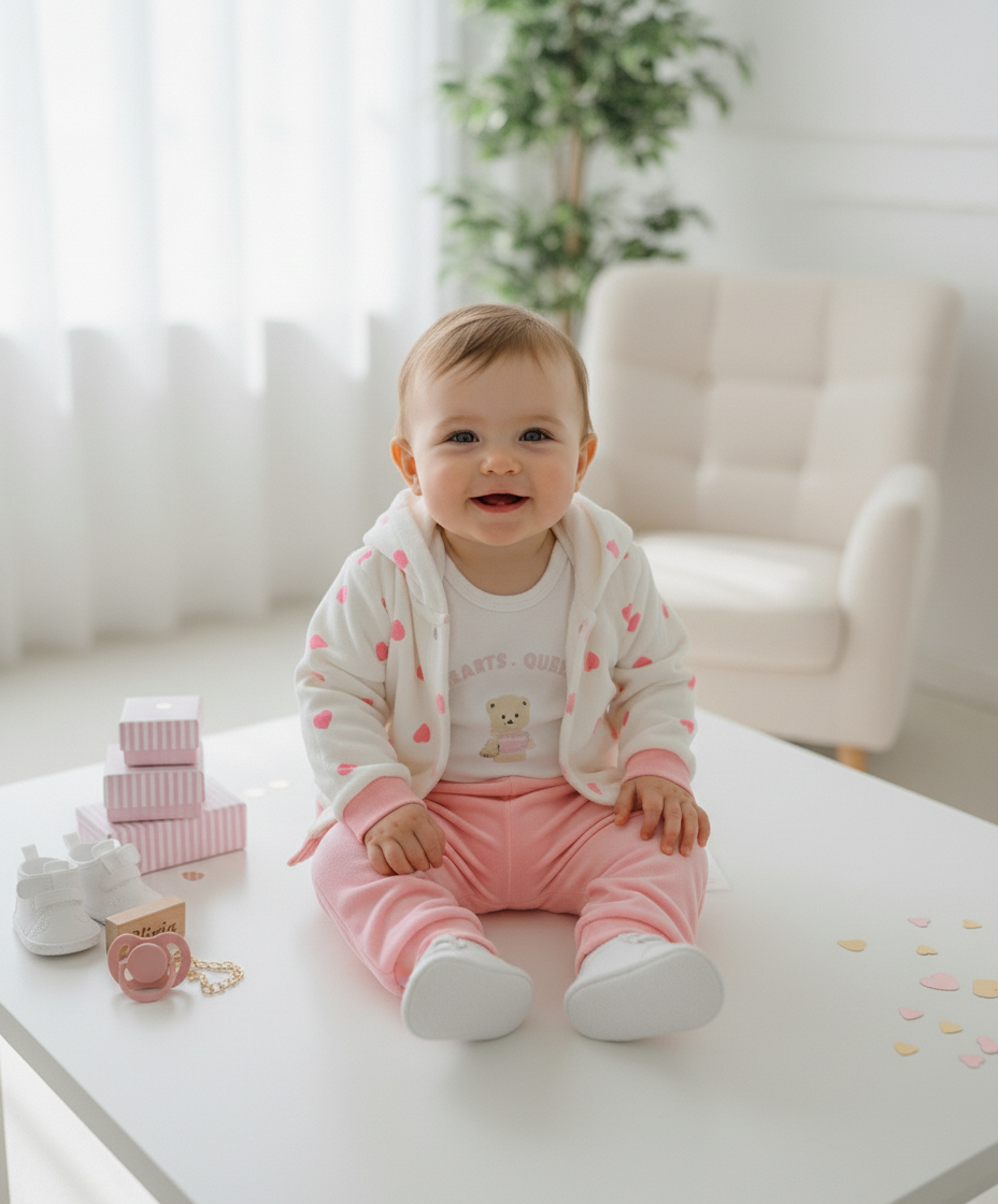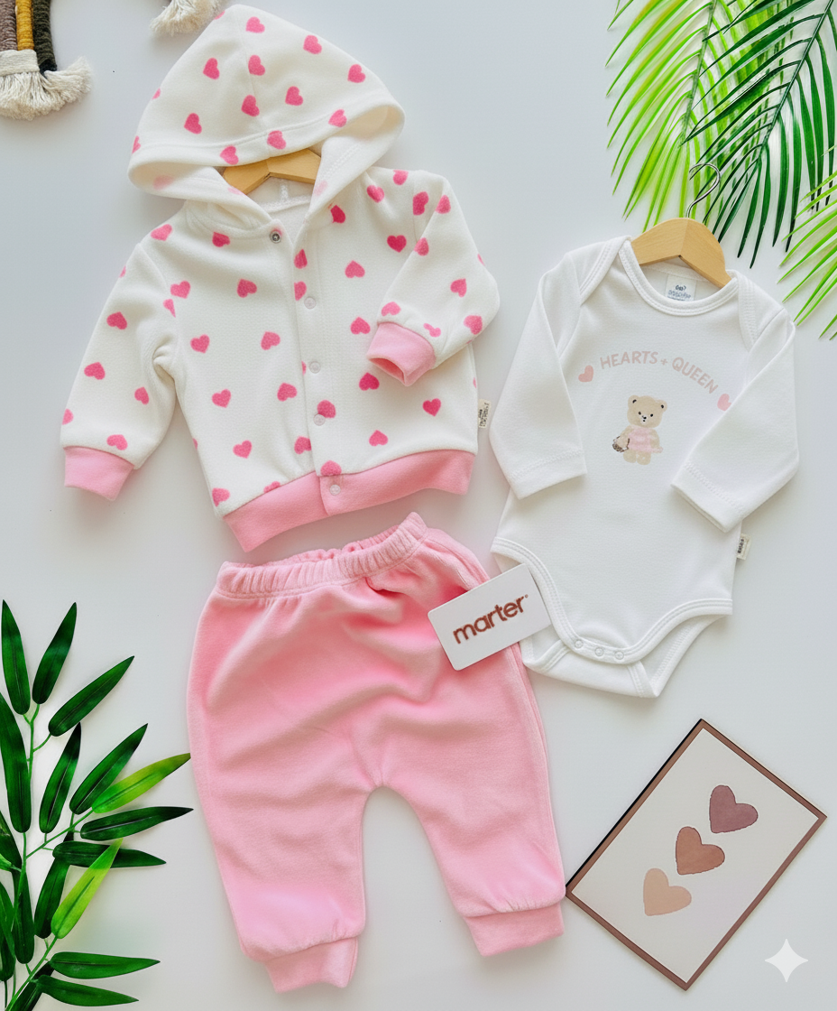 يتكوّن من 3 قطع أنيقة: سترة بقبعة مزينة بفيونكة، بودي مطبوع كرتوني، وسروال مريح.