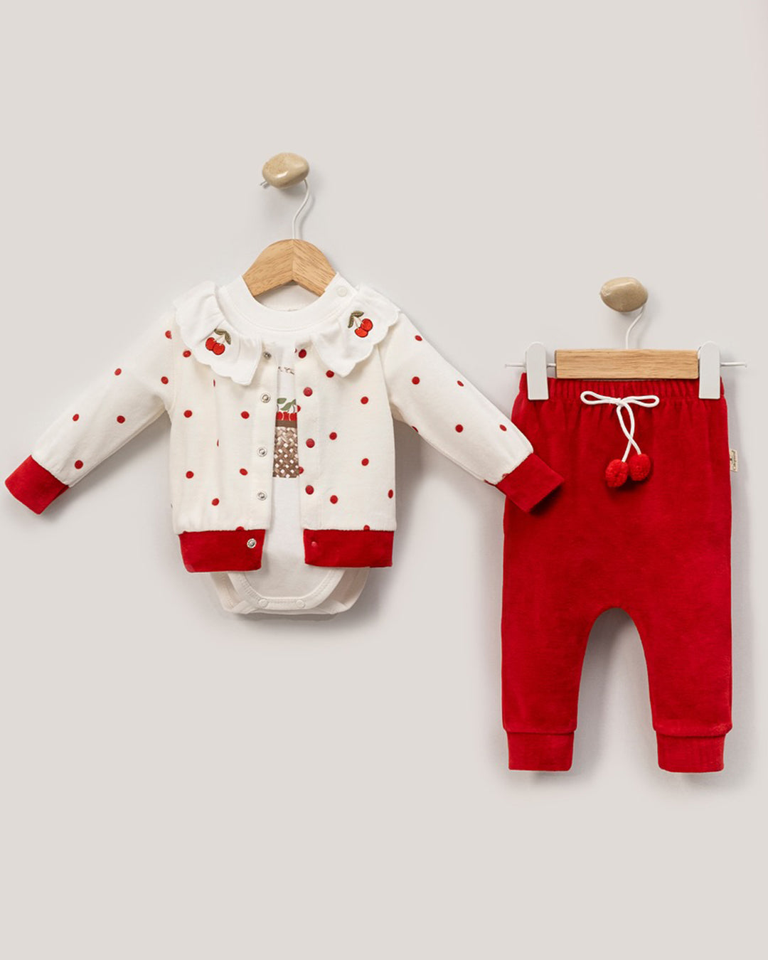 يتكوّن من 3 قطع أنيقة: سترة بقبعة مزينة بفيونكة، بودي وسروال مريح.