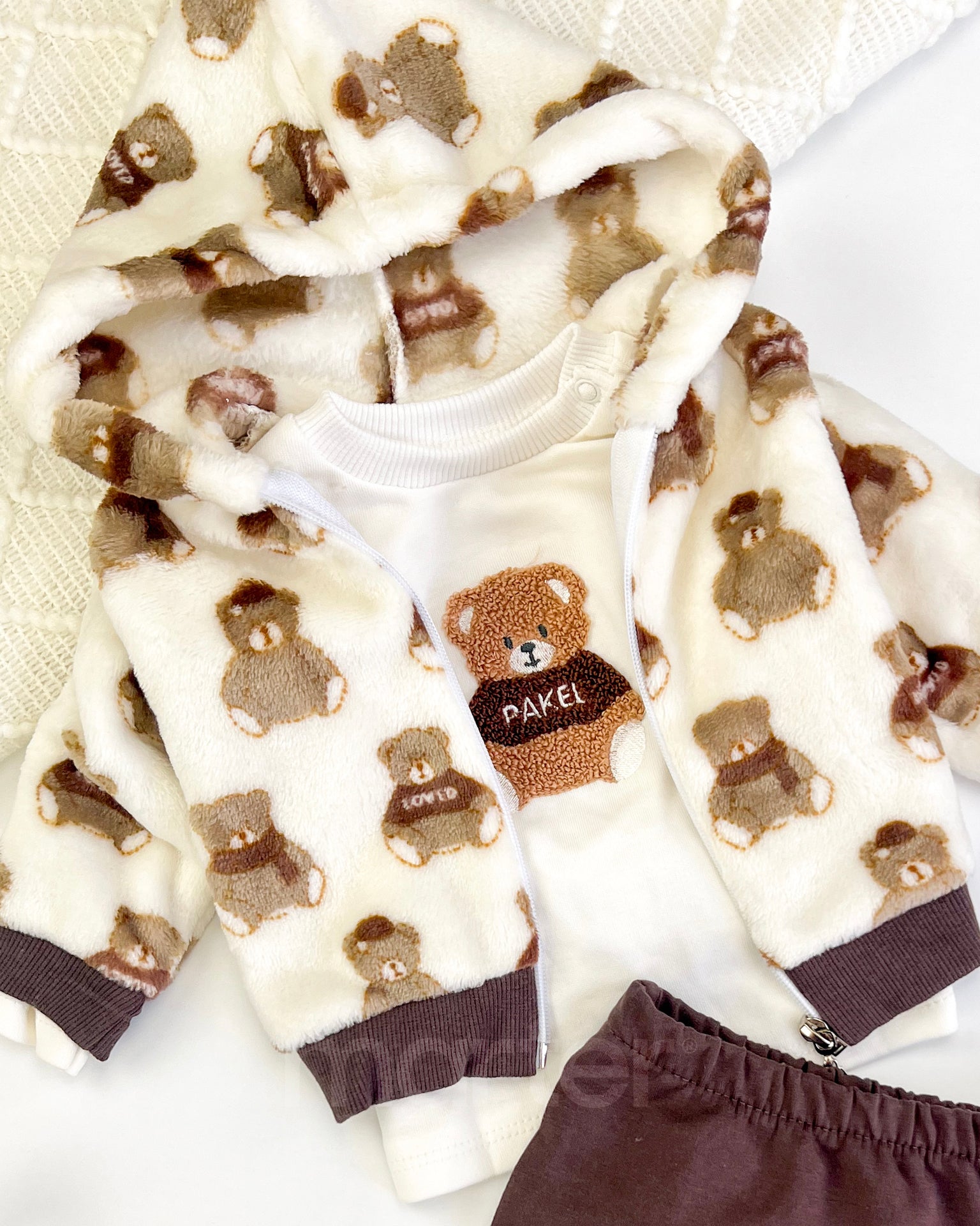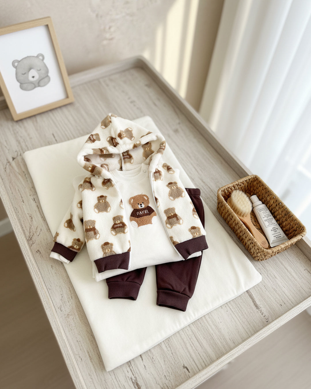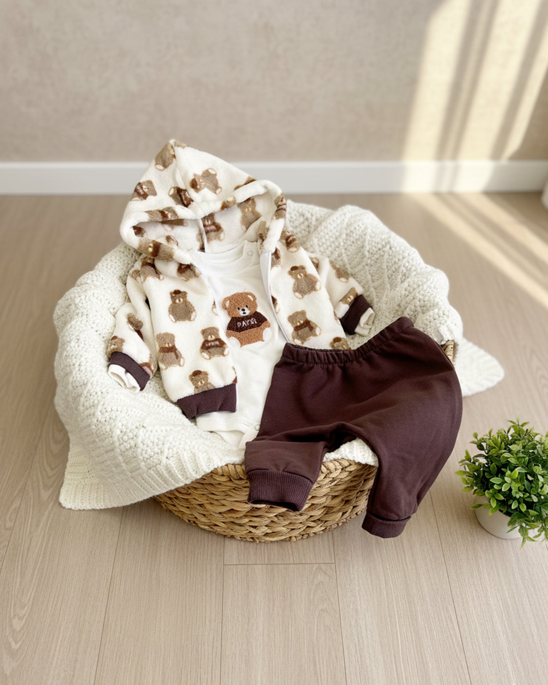 يتكوّن من 3 قطع أنيقة: سترة بقبعة مزينة بفيونكة، بودي مطبوع كرتوني، وسروال مريح.