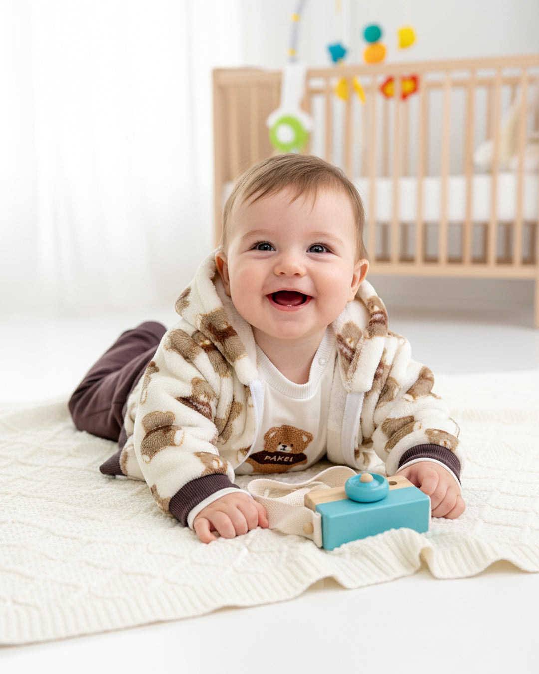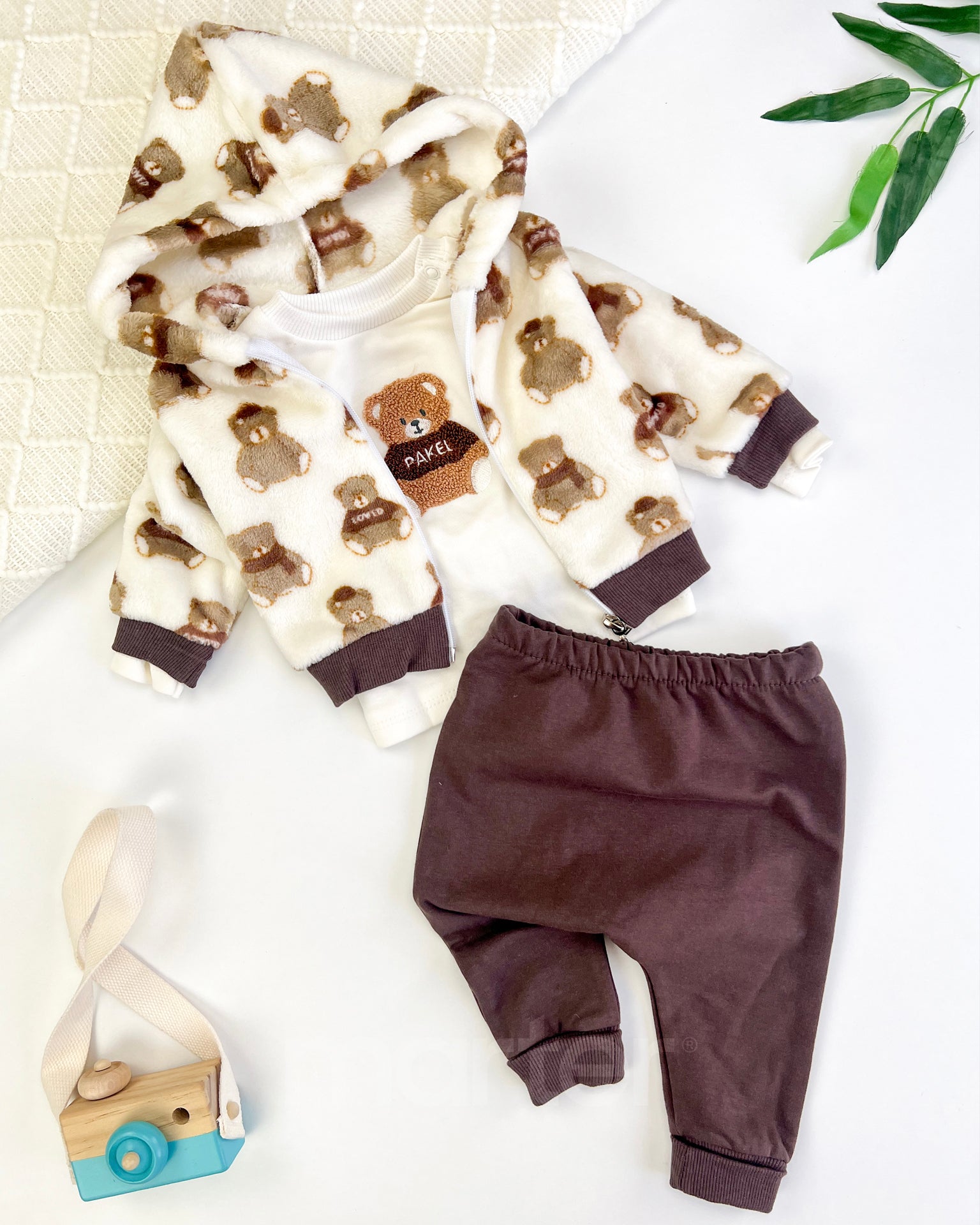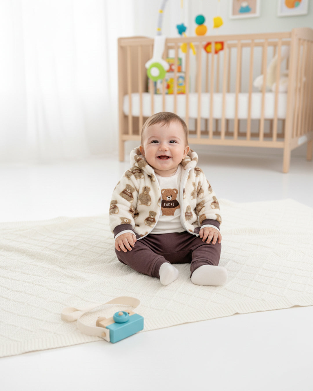 يتكوّن من 3 قطع أنيقة: سترة بقبعة مزينة بفيونكة، بودي مطبوع كرتوني، وسروال مريح.