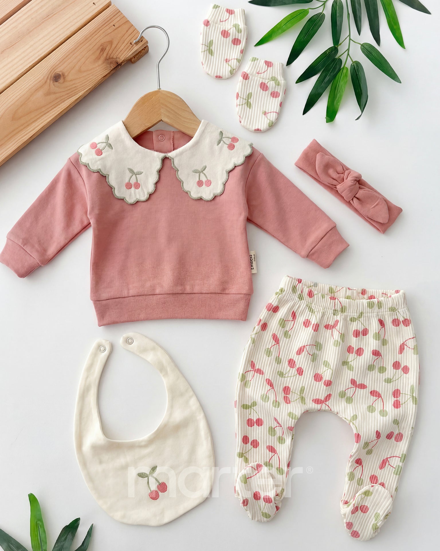 طقم ناعم و جميل للبنات حديثي الولادة مزين بحبات الكرز